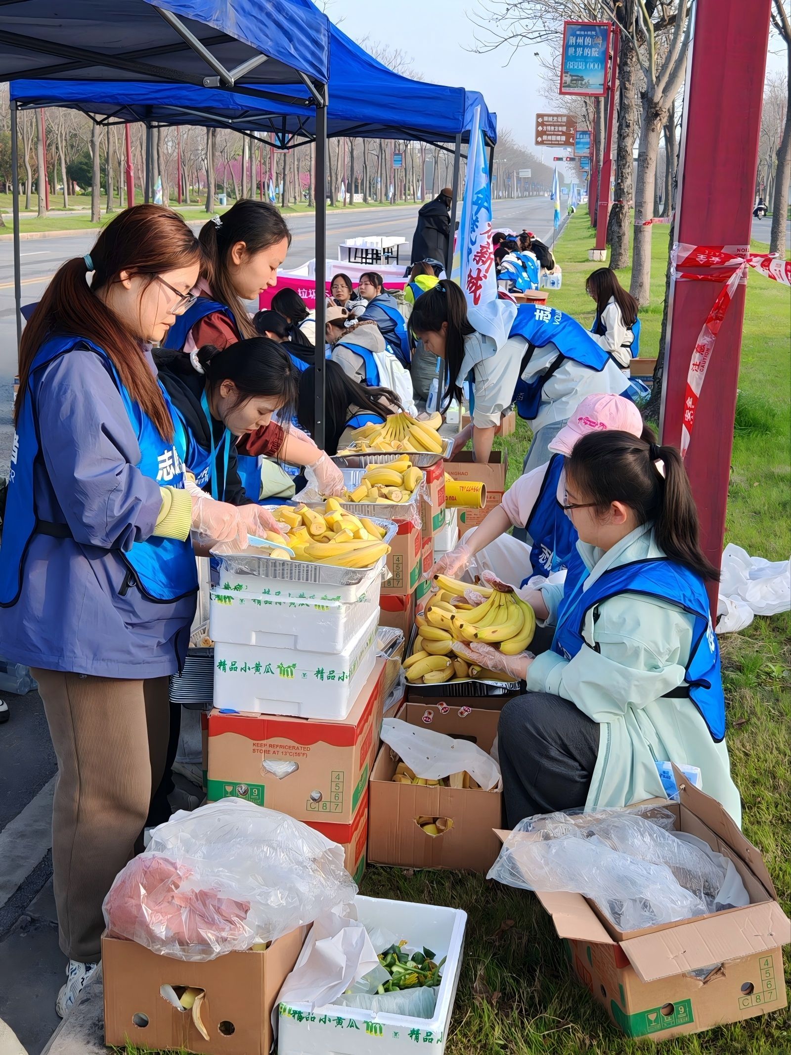 赛事当天,志愿者们早早集结、迅速行动,分赴各个补给站及半马、全马终点,有序开展赛前筹备工作。